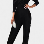 Un diseño elegante que equilibra comodidad y estilo con un toque atrevido. Este mono presenta un escote asimétrico con hombro descubierto, decorado con perlas, y un corte relajado que estiliza la figura sin esfuerzo. Ideal para eventos de noche o cenas elegantes.