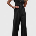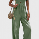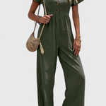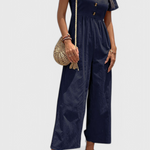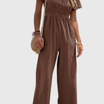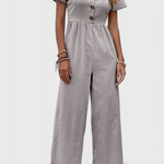 Adopta el arte de la elegancia desenfadada con Camila: un mono de manga corta diseñado para la comodidad y el impacto. Confeccionado con tejido de primera calidad, su silueta de pierna ancha y su acabado con botones en el frente aportan estructura a tu guardarropa de clima cálido. Una prenda relajada pero pulida para días soleados y noches casuales.