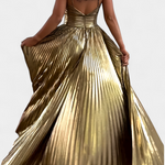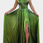Aikaterini Vestido Maxi Metálico con Cuello Cruzado y Abertura