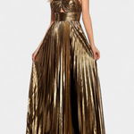El vestido Aikaterini brilla con presencia majestuosa gracias a su tejido metálico, su cuello cruzado y su abertura frontal con pliegues estratégicos. La silueta amplia cae con elegancia hasta los tobillos, creando un movimiento etéreo en cada paso. Una pieza pensada para destacar bajo las luces y dejar huella en cualquier evento.