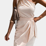 La elegancia moderna fluye sin esfuerzo en el Vestido Ainsley, que presenta un escote asimétrico de un hombro, una suave caída en la cintura y un dobladillo asimétrico. Diseñado para realzar y moverse con belleza, aporta una sofisticación sutil a cada evento o día especial.