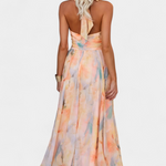 Artístico, etéreo y con encanto veraniego, el vestido Alaia es una oda a la feminidad libre. Su silueta fluida y el cuello halter estilizan con delicadeza, mientras la espalda descubierta aporta frescura y sensualidad. El estampado tipo acuarela transforma cada movimiento en una pincelada de color, haciendo de esta pieza una expresión de estilo y ligereza.