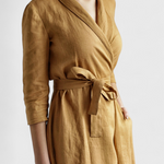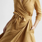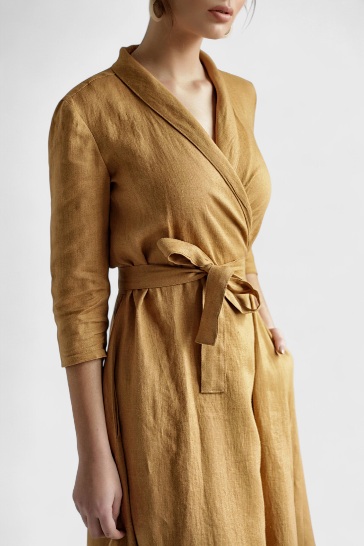 Elegancia clásica con un giro atemporal. El vestido Sharon destaca por su diseño envolvente con cuello de solapa, mangas largas y una silueta midi que estiliza con naturalidad. Confeccionado en una mezcla de algodón y lino, ofrece una sensación ligera y estructurada perfecta para el entretiempo.