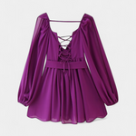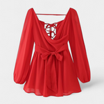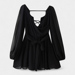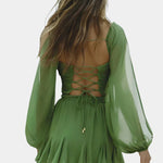 Fresco, encantador y con un toque romántico, Skylar es el vestido ideal para días soleados y noches especiales. Su diseño envolvente, mangas vaporosas y volantes en movimiento crean una silueta etérea que realza sin esfuerzo tu feminidad.