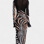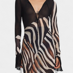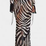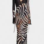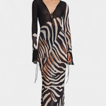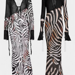 Audaz y magnético, el vestido Taisia combina un estampado animal con transparencias estratégicas que insinúan sin mostrar demasiado. Su escote profundo con cordones, las mangas acampanadas y la silueta fluida lo convierten en una pieza icónica para un look nocturno lleno de carácter.