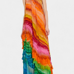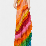 El vestido Tori está diseñado para destacar con un vibrante estampado tie-dye y volantes en cascada que aportan movimiento y textura. Su escote halter y silueta suelta en georgette de viscosa crean una estética fluida, femenina y llena de energía. Perfecto para celebraciones especiales o noches inolvidables.