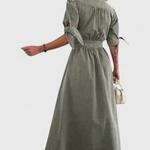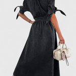 Elegante, ligero y sin esfuerzo femenino: el Vestido Adelina combina la comodidad diaria con una suave elegancia. Con un escote en V favorecedor, mangas cortas con lazo y botones de estilo madera natural, su silueta en A fluida ofrece justo la cantidad adecuada de estructura para días cálidos y momentos casuales.