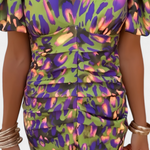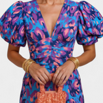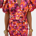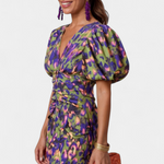 Una silueta poderosa que combina estampado vibrante y diseño escultural con audacia y elegancia. El vestido Wibia fusiona su fruncido central favorecedor con mangas voluminosas y un escote en V para un look que resalta con fuerza y feminidad en cada ocasión especial.