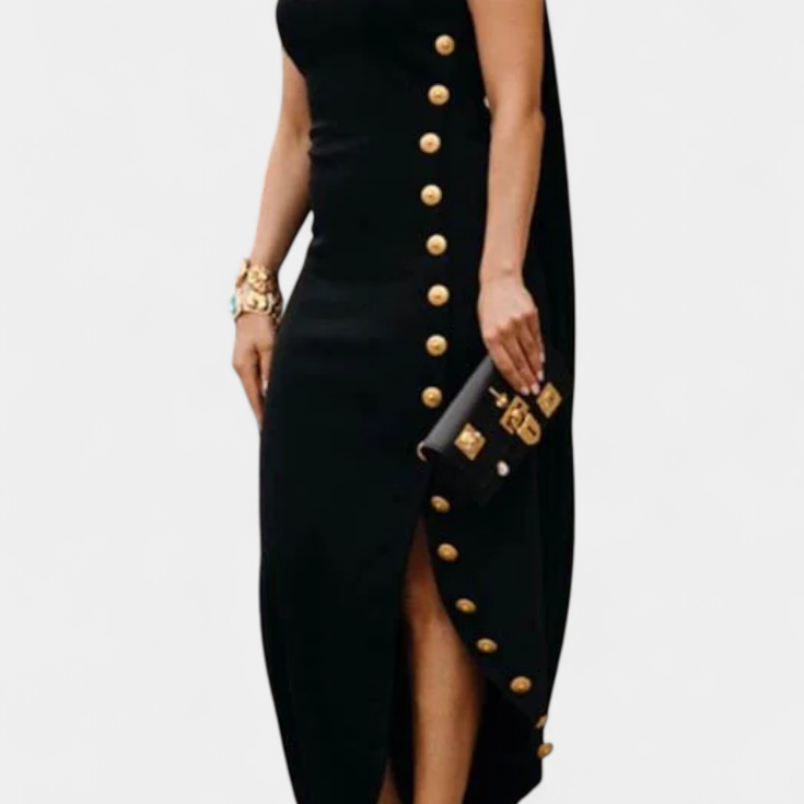 Aphrodite Vestido Asimétrico con Botones Dorados Decorativos