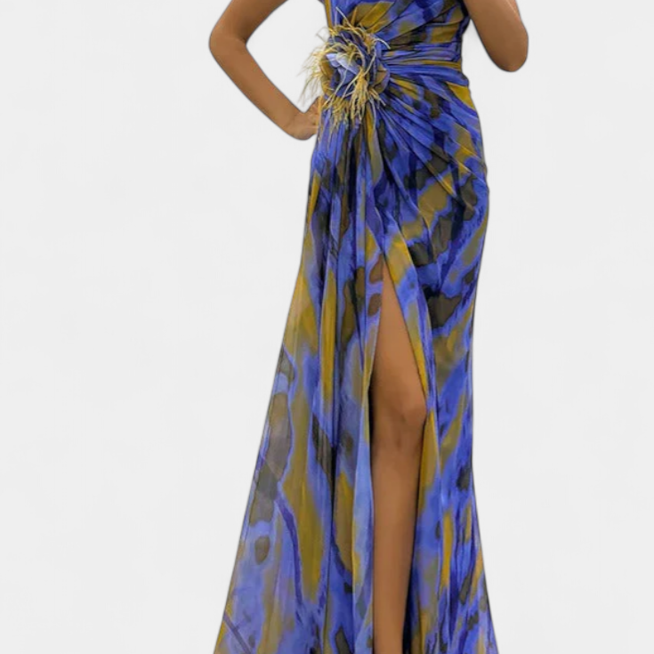 Aylin Vestido Maxi Asimétrico con Estampado Vibrante