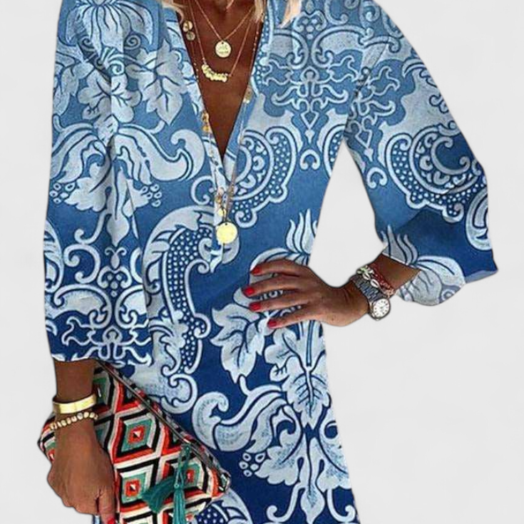 Rufina Vestido Mini Azul con Escote en V y Manga Larga