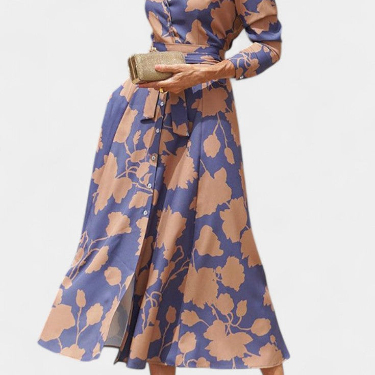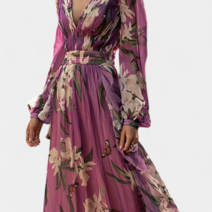 Ruth Vestido Largo Floral con Mangas 3/4 y Paneles Volantes