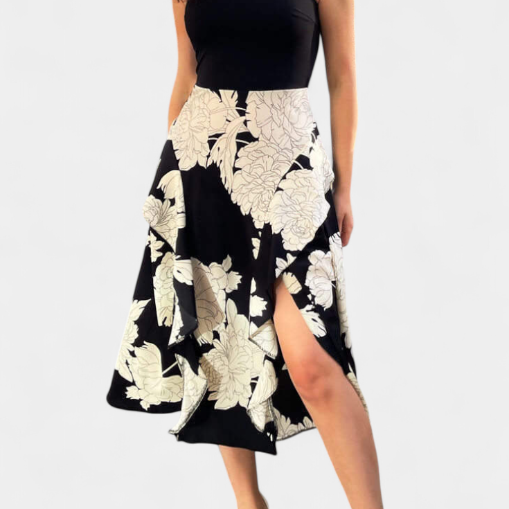 Radmila Vestido A-Line con Cuerpo Negro y Falda Floral en Contraste