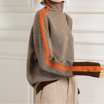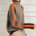 Despídete de los tejidos que pican y los jerséis sin forma. El jersey de cuello alto Eleanor está confeccionado con un tejido de punto de primera calidad y tacto suave que resulta agradable, ligero y cómodo sobre la piel. El llamativo diseño en espiga con detalles en naranja cálido aporta un toque de sofisticación moderna, mientras que su corte holgado y favorecedor lo convierte en una prenda versátil para llevar tanto de día como de noche.